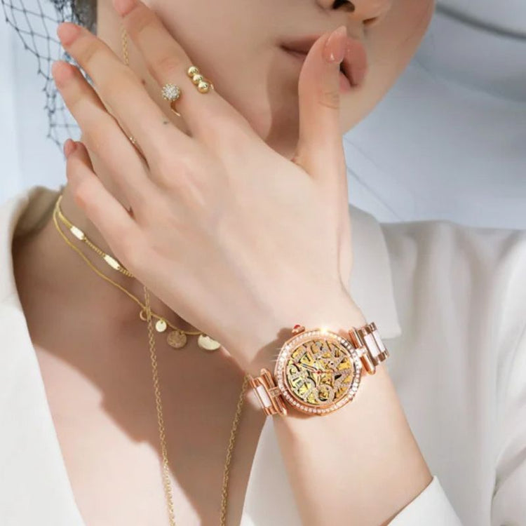Certains modèles intègrent tourbillon visible et mécanisme squelette qui révèlent la beauté mécanique fascinante. Cette montre mécanique de luxe fonctionne grâce au remontage automatique perpétuel, éliminant toute contrainte avec couronne sertie diamants et fond saphir transparent pour admirer le calibre d'exception miniaturisé pour poignets fins.