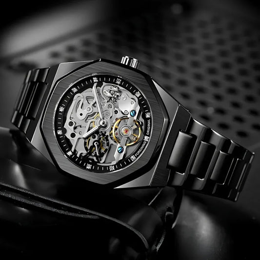 Montre mécanique squelette homme octogonale en acier inoxydable
