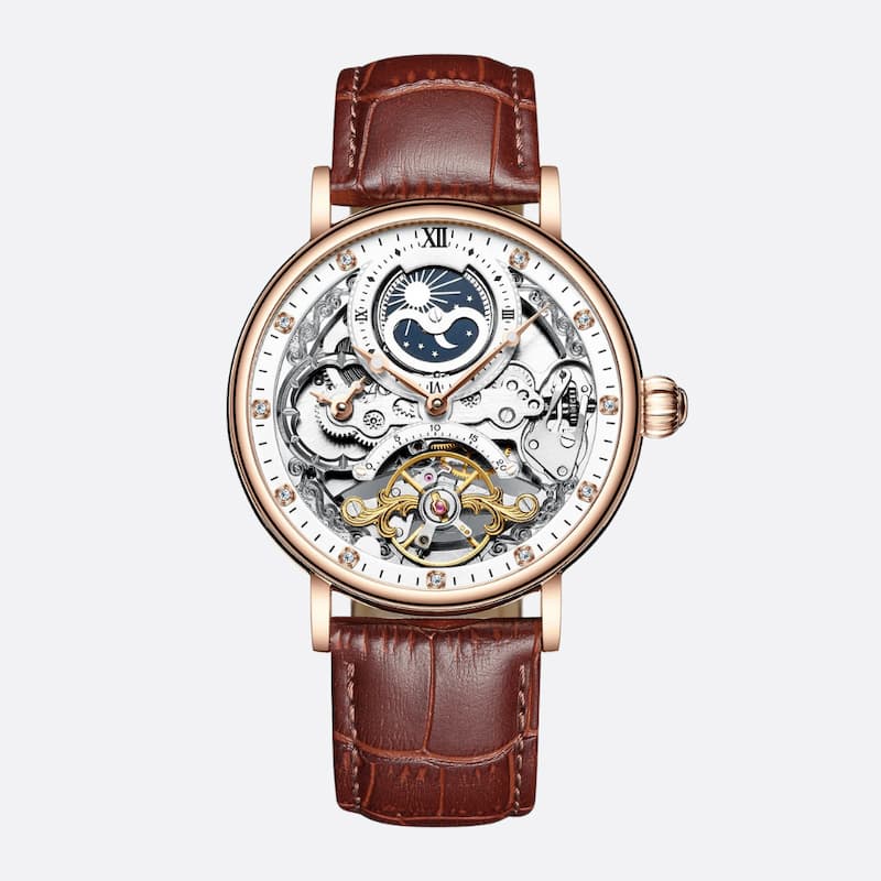 Plongez dans l'univers fascinant de l'horlogerie avec cette montre squelette pour homme qui dévoile ses mystères mécaniques. Son tourbillon captivant danse sous vos yeux tandis que les phases lunaires ajoutent une touche poétique à votre poignet. Automatique et élégante, elle accompagne vos aventures avec style grâce à ses aiguilles luminescentes et sa robustesse aquatique